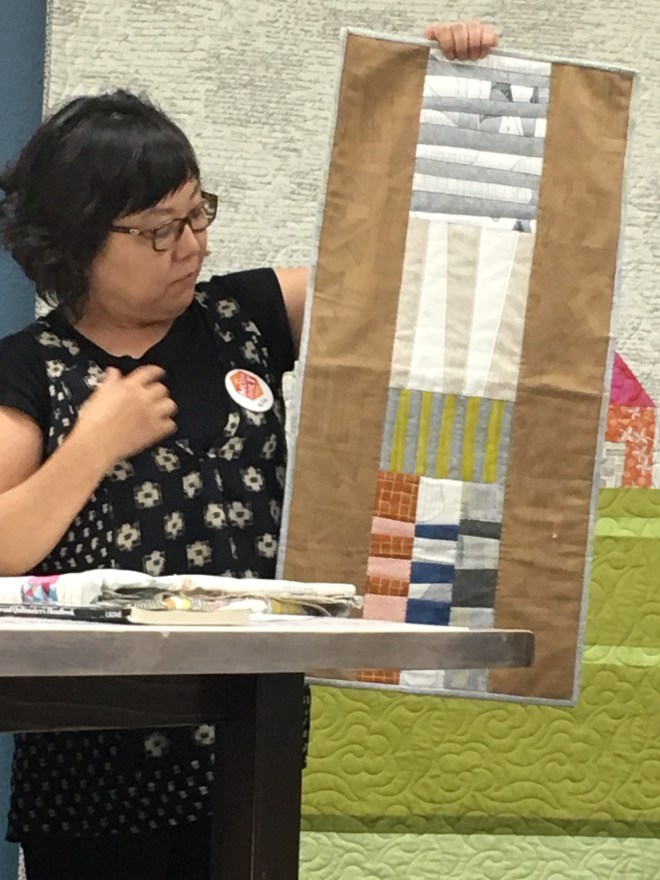 Previous ImageNext Image img_8393 Cecile showing off Carolyn Friedlander’s new fabrics and quilt patterns