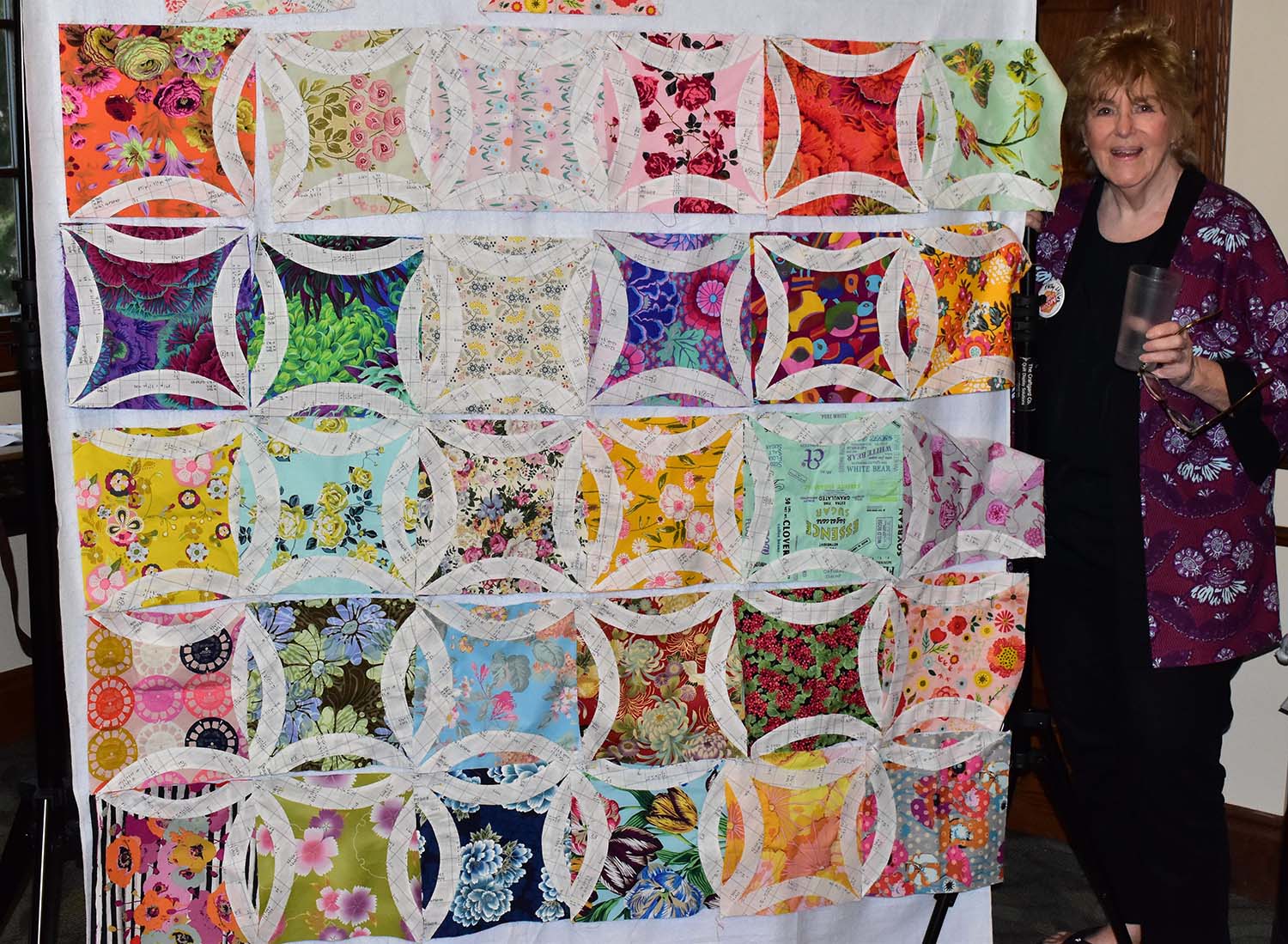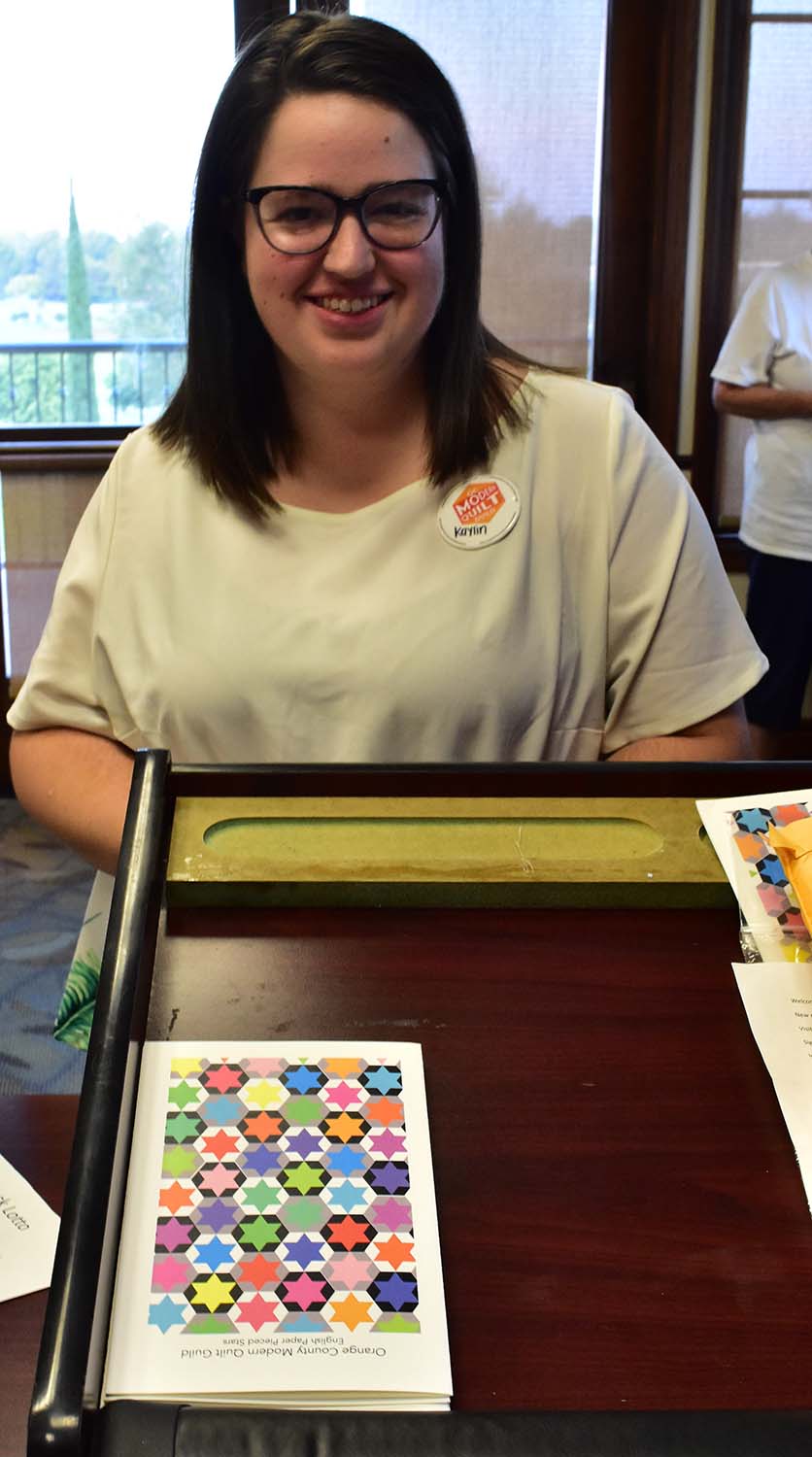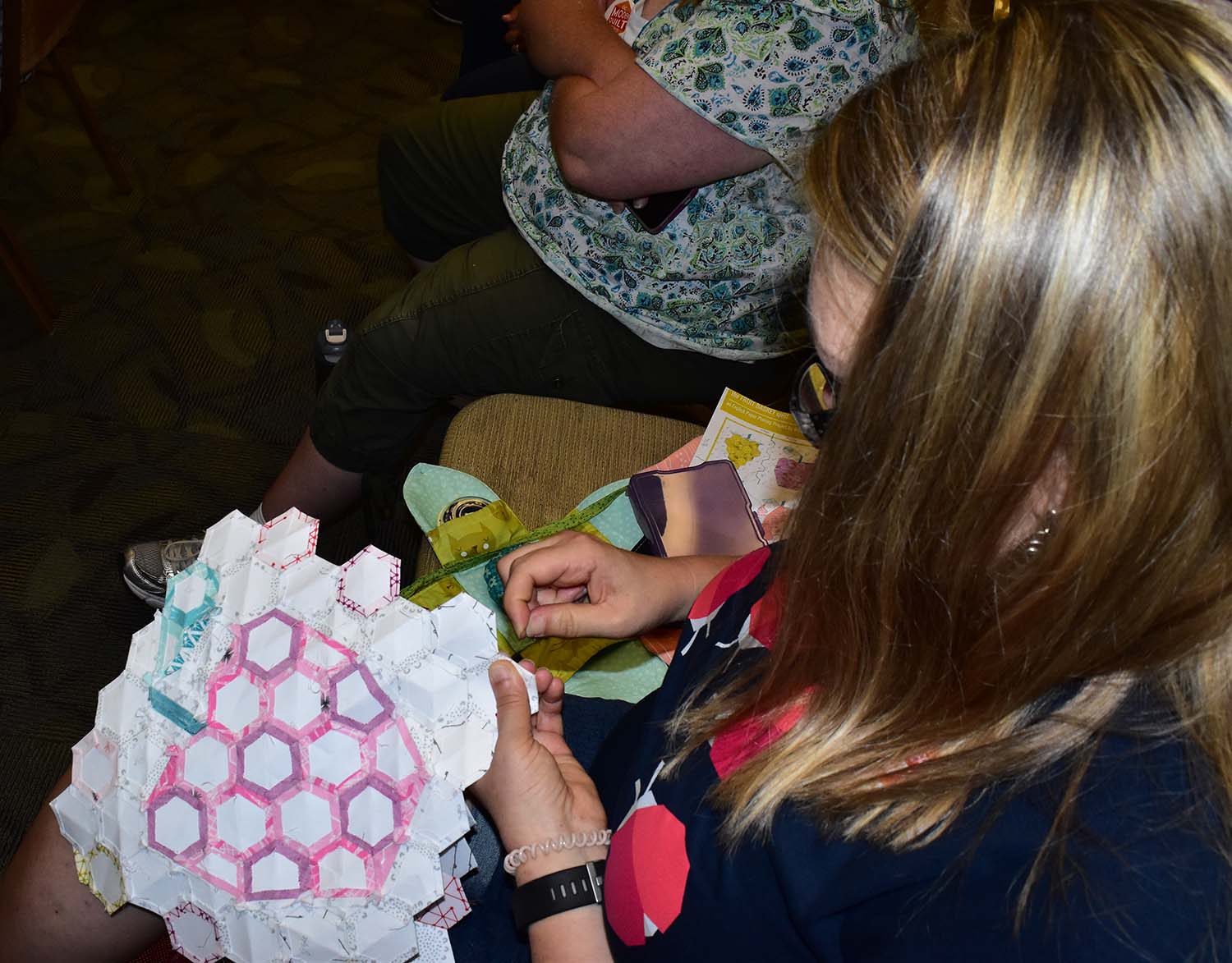 This month’s Block Lotto is English Paper Piecing! Each person will create a heagon with either a white, grey or black background, once all of the blocks are joined they will also create a secondary tumbling blocks pattern.