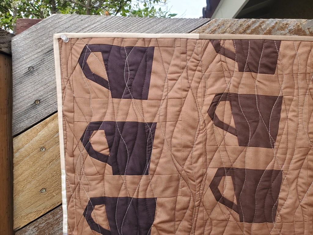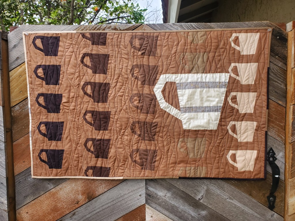 About the Quilt: Amy Friend inspired me to use paper piecing, gradation of color and to use the alternative grid work. I modified a paper pieced coffee cup that we used for block lotto to make it into a mug. I was inspired also by a photo of a poster of a large coffee cup so I added the oversized mug. It was fun choosing the browns including espresso and capuccino. The quilting is simple but could be steam rising up.