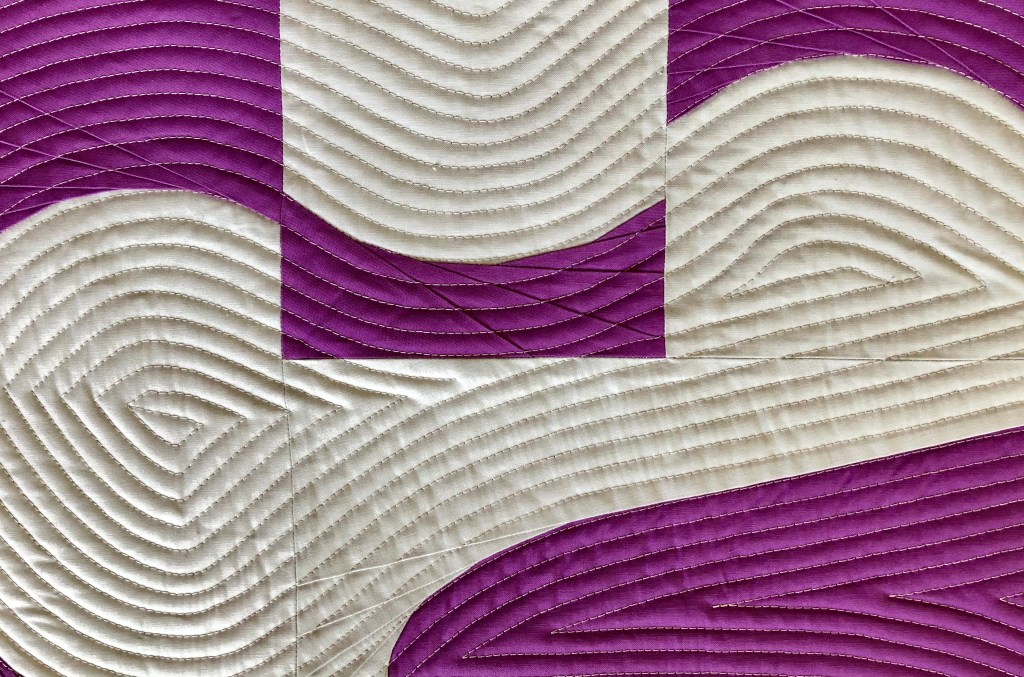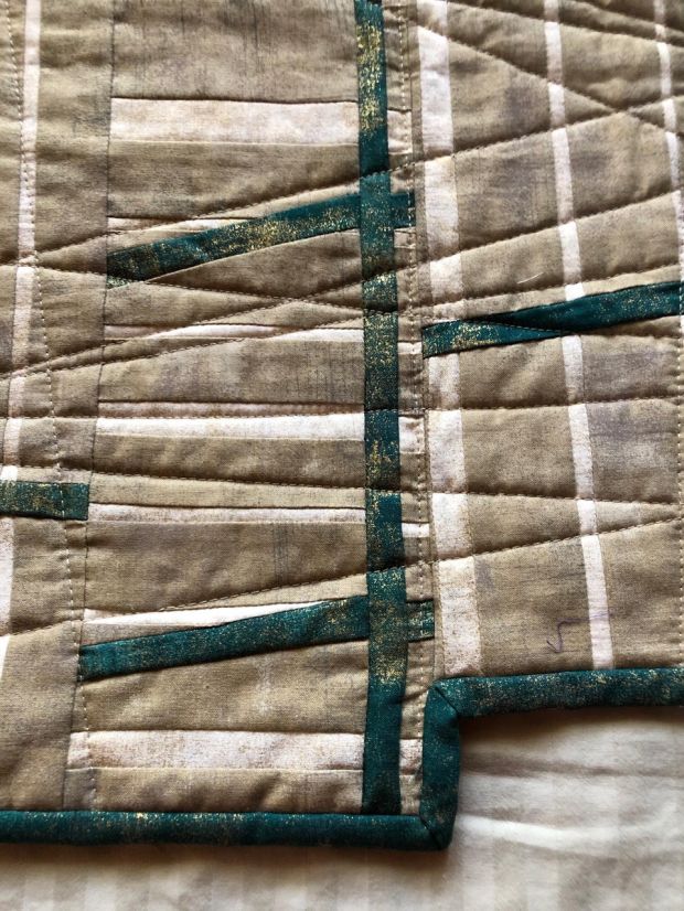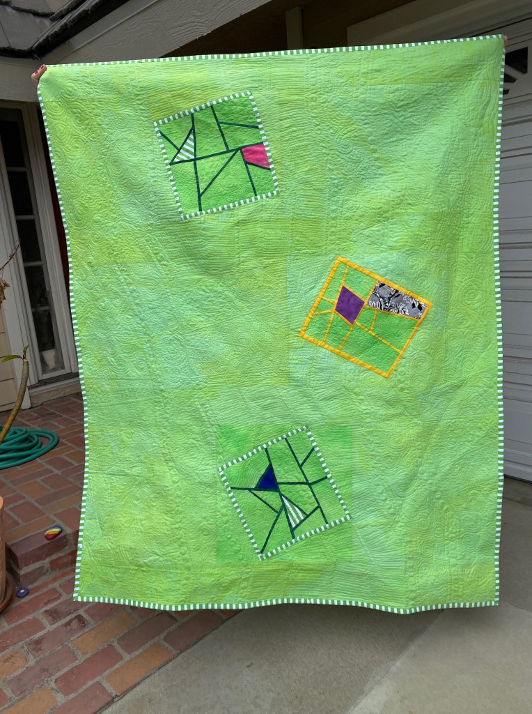 About the Quilt: This quilt started with the 3 Fractured blocks from the National Quilt Museum’s 2019 sew along. In this pattern you cut a piece of fabric improv and then swap out some of the pieces with new fabrics. I love the dash of pink and the black and white against the hand dyed green fabric. I also love stripes so I decided to frame the blocks with the green and white striped fabric and was so happy that I had enough to bind it with the same fabric! I used a lot of negative space and had fun quilting some ghost blocks and doing some free motion quilting and a little bit of ruler work also.