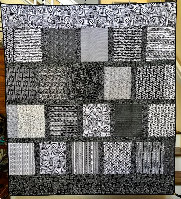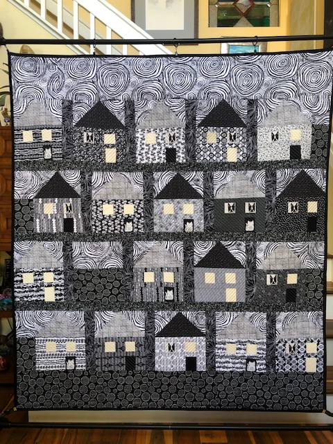 About the Quilt: A black and white quilt-as-you-go quilt. The windows are winter white which makes it look like the lights are on.