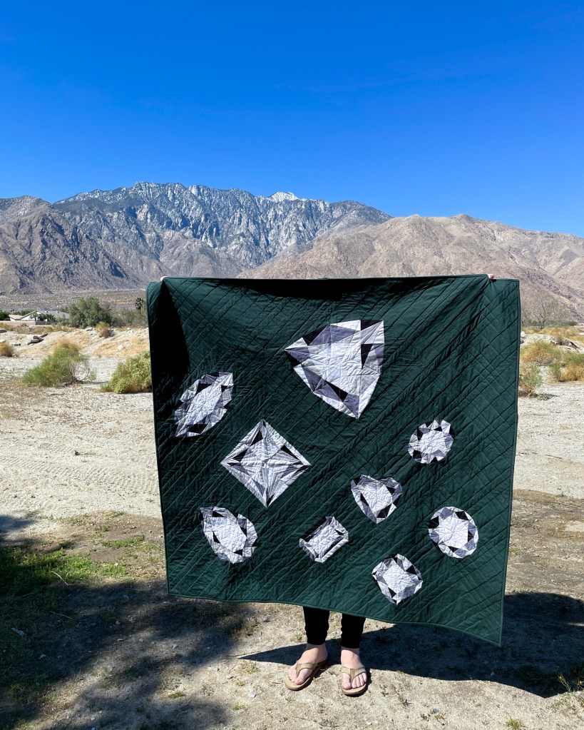 About the Quilt: My quilt is made to look like someone dumped a bag of diamonds onto a lush piece of velvet.