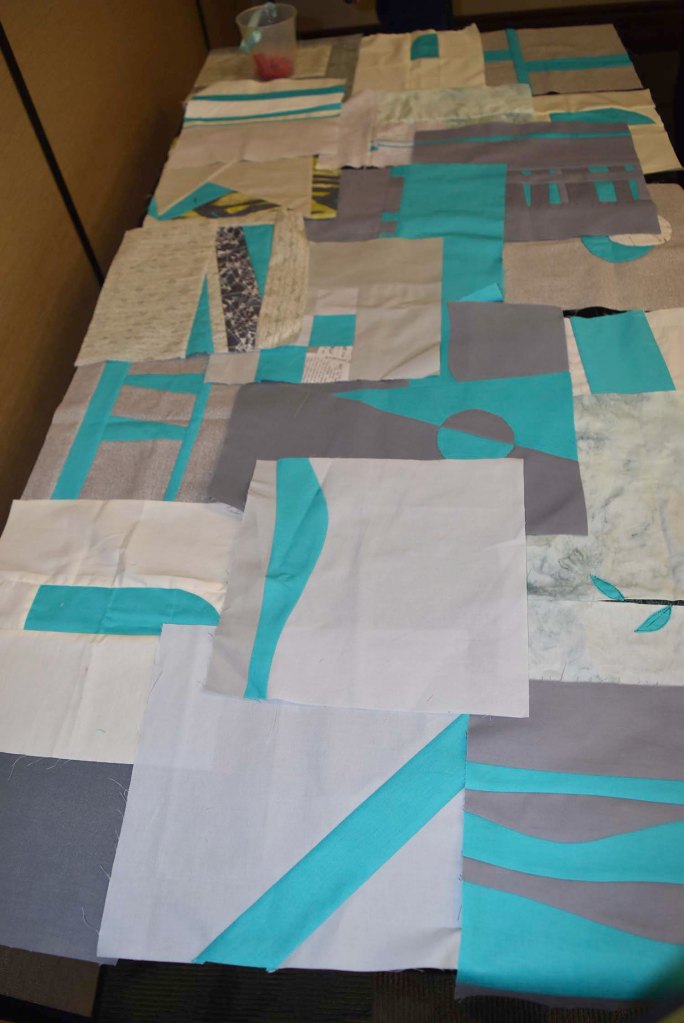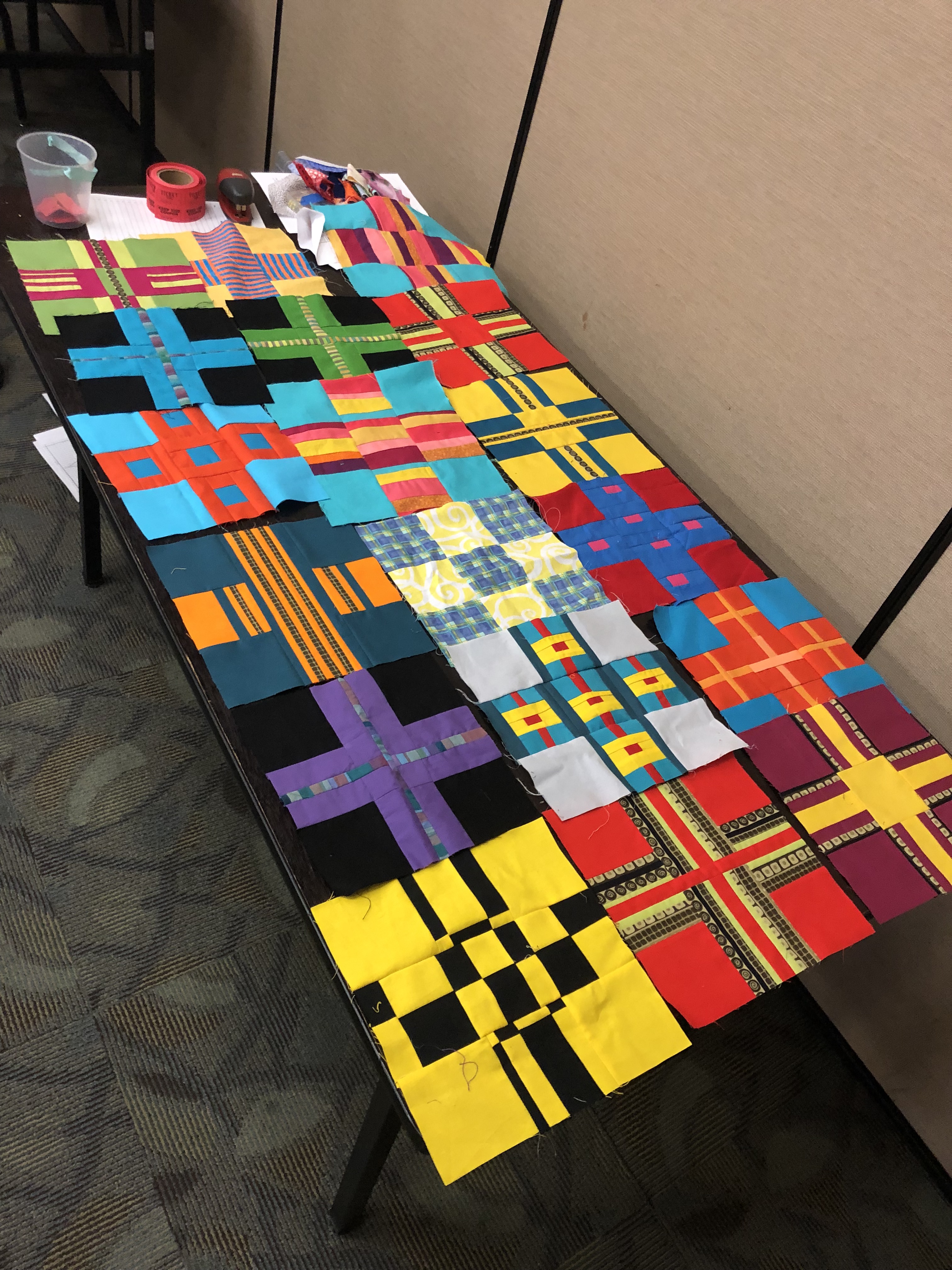 This months block were inspired by Maria Shell’s work and her exhibit at Visions Museum in San Diego. See her Instagram “Tales of a Sticher” for reference. Each block should make a nine patch, making a cross. Use solid colors only for the outside and aim for a strong mix of fabrics. Make your own prints by mixing patterns, stripes and blocks.