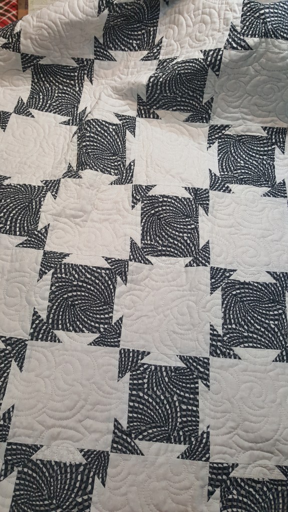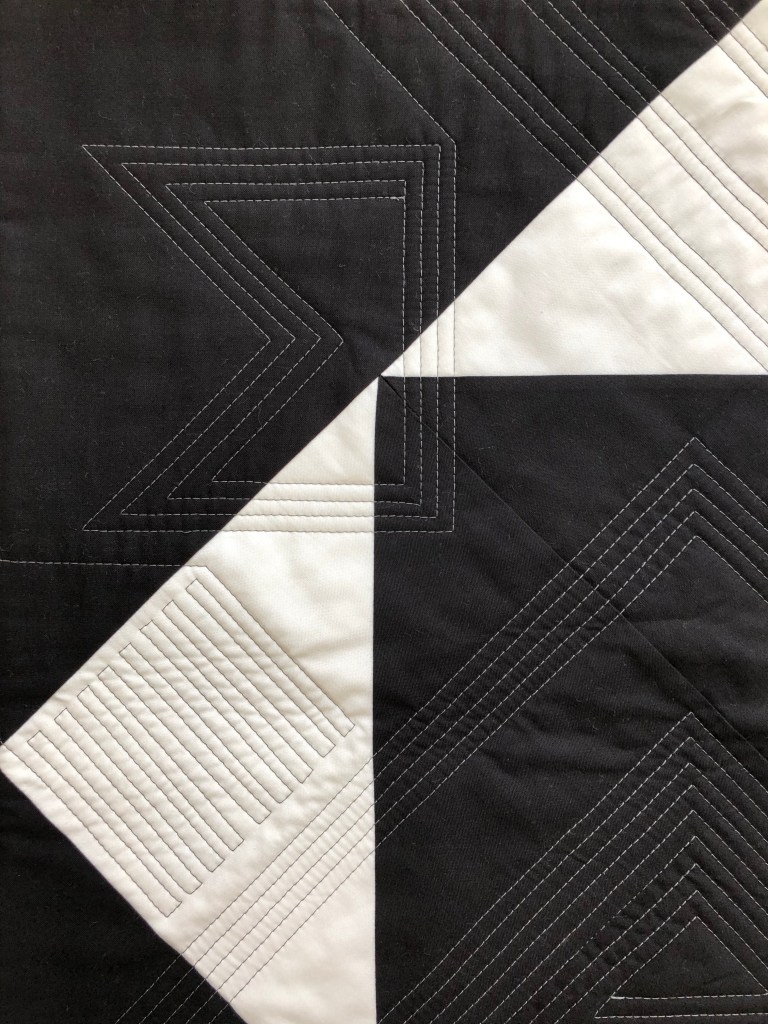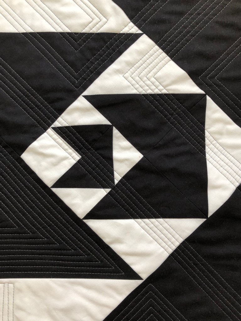 Quilter: Helene Born Quilt Name: N/A Designer: Soiree by Amy Ellis Description: Pieced block (6″) set with white on white. Quilted on my longarm using a panograph. Opposites Represented: Black & white