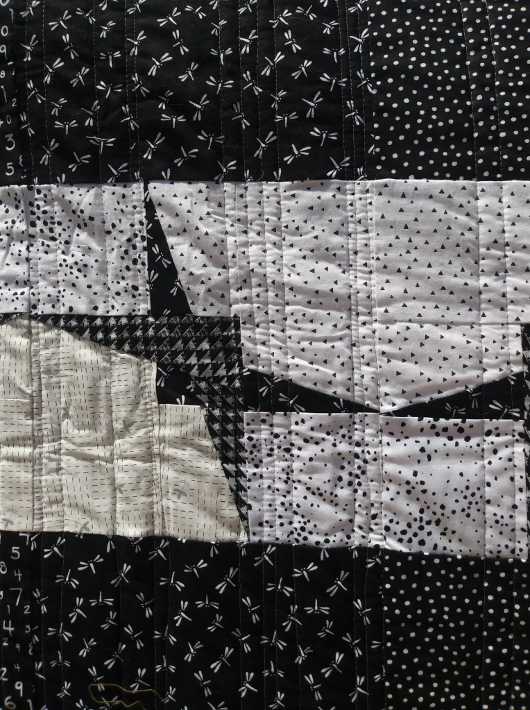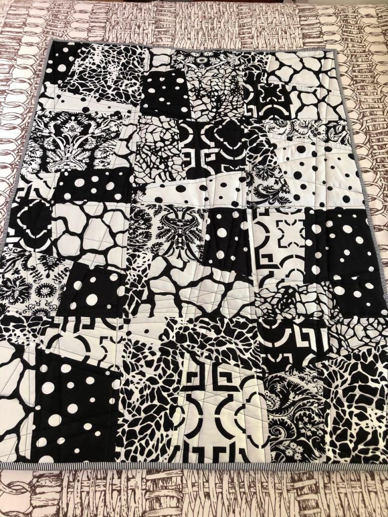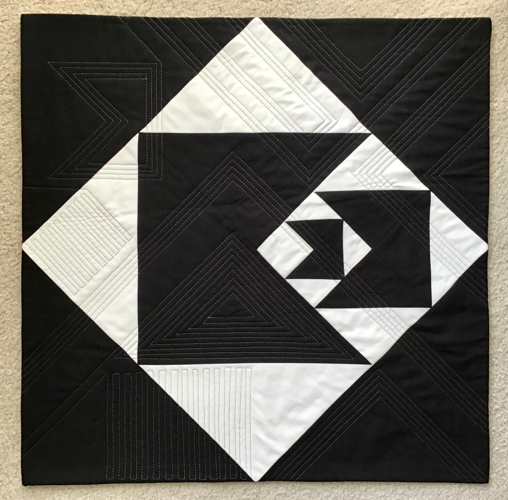 Quilter: Susie Johnson Quilt Name: Homage Designer: Geraldo de Barros via his painting, Diagonal Function Description: This 24”x24” wall hanging is my quilted homage to Geraldo Barros’ 1952 painting, Diagonal Function. His very modern design from 68 years ago; my fabric re-creation with quilting in 2020. This is the first time I’ve drafted my own pattern, and not being a math person, I’m tickled that I figured out the correct proportions. Quilted on my domestic machine – completely improv, which is really out of my wheelhouse – a good challenge for me. Opposites Represented: Black and white, shapes (horizontal, vertical, diagonal)