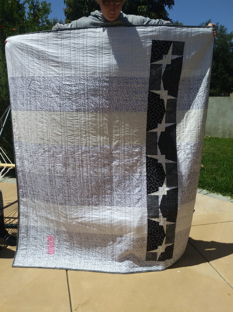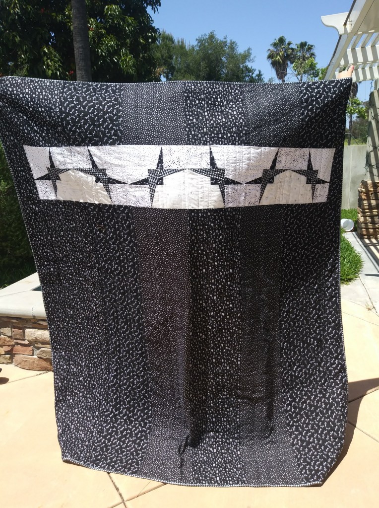 Maker: Lisa Handley Book: The 100 Rebellion About this Quilt: This quilt was made during the Pandemic after choosing my book for the challenge. It was made when things were in chaos and we were unsure about what was next for humanity. I made it with material I had – and not perfect. It kind of looks like stars in a murky sky. It’s metal looking. While making it, I felt very much like the book, asking what was next – everything was unknown. The 100 Book Series is set ninety-seven years after a nuclear war has destroyed civilization, when a spaceship housing humanity’s lone survivors sends one hundred juvenile delinquents back to Earth, in hopes of possibly re-populating the planet.