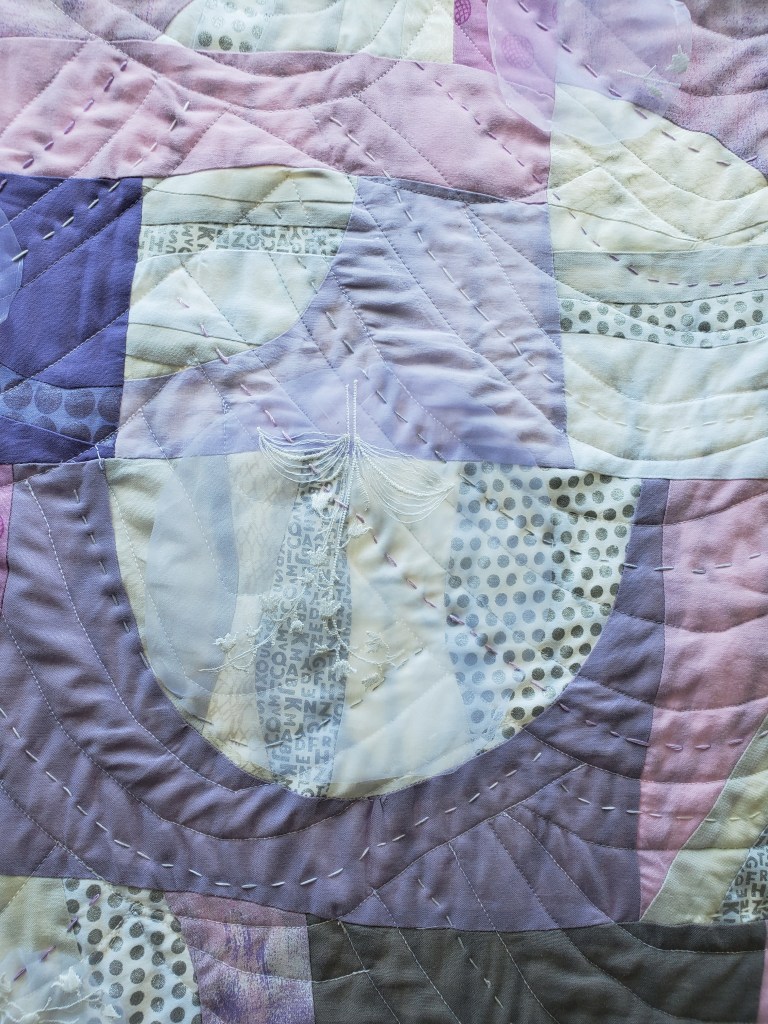 After a relaxing vacation, I had planned to do the Calm section. Who knew that it became one of least calm times in modern life- Covid time? It took a week or so of just processing so many of the losses before I could tackle sewing again. I began making curved organic shapes in soft lilacs and white to represent Calm. I machine quilted soft, echos of curves, like waves quenching the anger. I included some overlap of the anger colors into the calm. The anger may still reside in smaller pieces and it may rise up in unexpected ways.