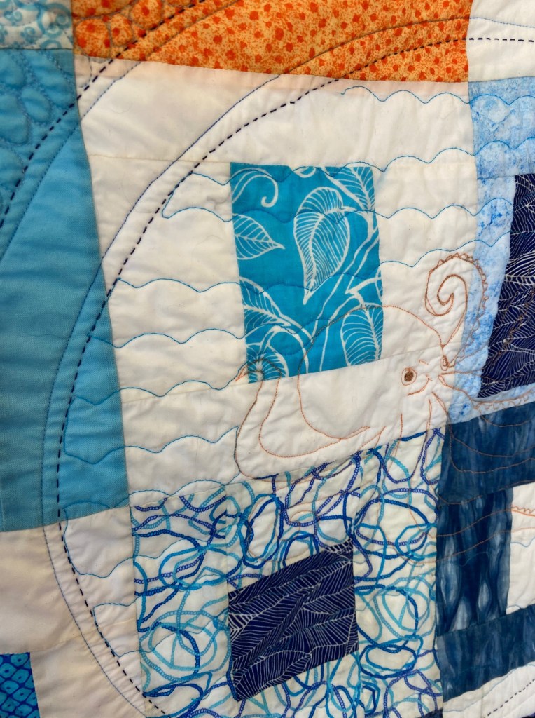 Quilter: Jeri Polizzotto Quilt Name: Improv by the Sea Designer: Jeri Polizzotto Description: I call this quilt “Improv by the Sea.” I loved the theme opposites and really couldn’t stop once I got going. I started with my favorite opposites on the color wheel – blue and orange. The center squares are the improv part, kind of subtle. Then I got going on the quilting and decided to throw in some large circles to contrast with the squares. Inside of those large circles I decided to quilt a sea creature. I love octopuses so I quilted one! I filled in between the large circles with different size (large & small) circles and had fun putting different motifs in a lot of the circles.