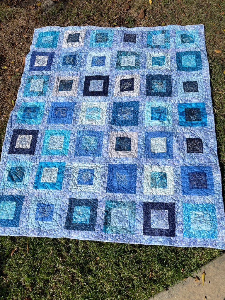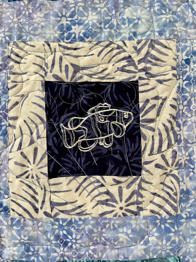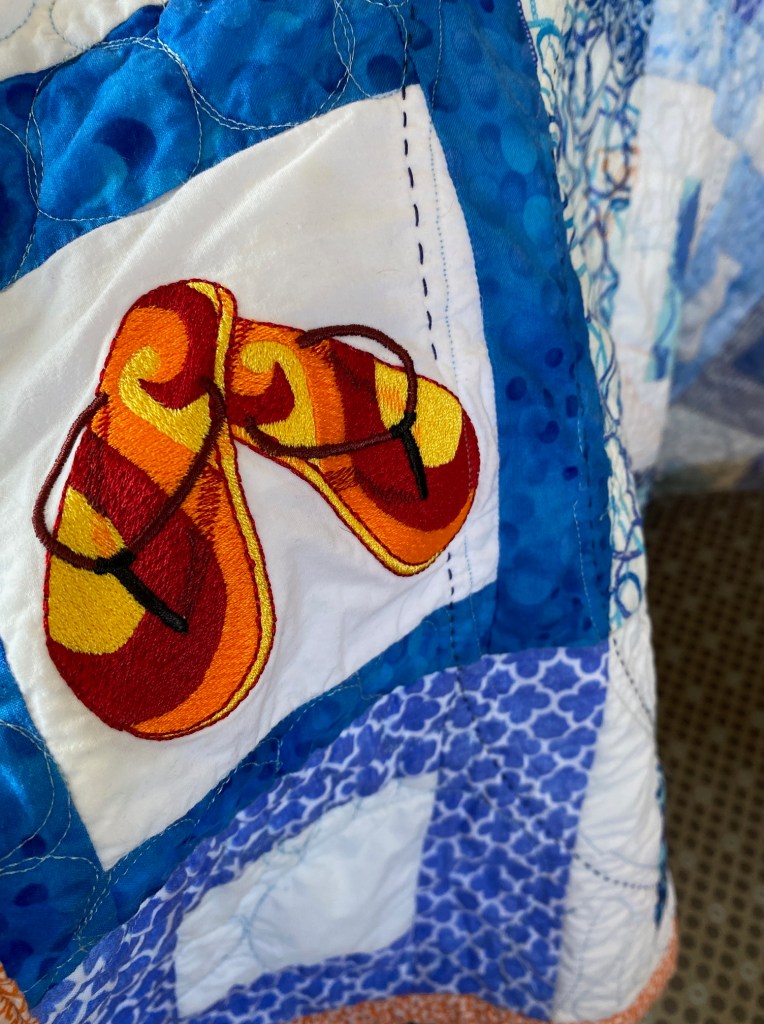 One day about 5 years ago I was at my sister in law’s house with my best friend and she had a bunch of embroidered flip flop blocks that she had gotten at a garage sale. We divided them amongst us and said that we would all make quilts out of them. Well I don’t think that any of us ever made quilts out of those blocks! It did however inspire me to get back into quilting after not having done it for more than 10 years (kids got in the way!). I put one of those flip flop blocks in there as kind of a reminder to myself of how much I love quilting and how it’s important in life to do things we love. Opposites Represented: Blue and orange, circle and square