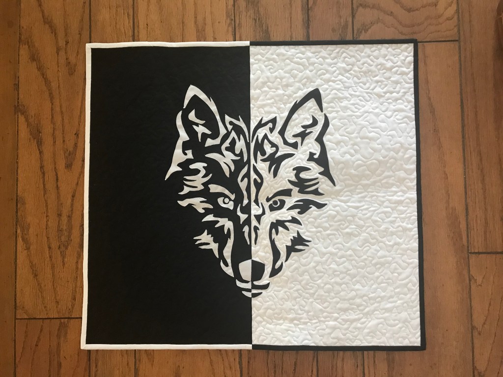 Quilter: Barbara Knapp Quilt Name: Wolf Designer: Barbara Knapp Description: Wolf face divided in half. I don’t know why but it reminds me that there are two sides to every story. Might be given as a gift to a 2020 graduate who has always believed that the wolf is her spirit animal. Opposites Represented: Black & white, side to side (even the binding is half & half)