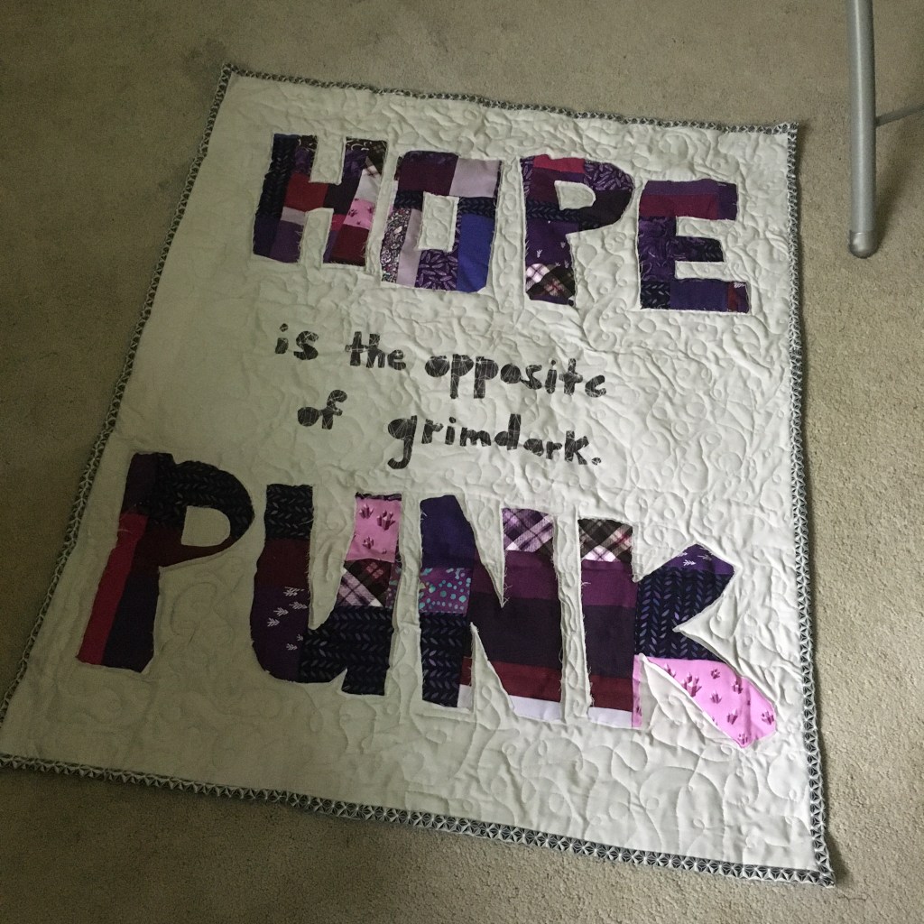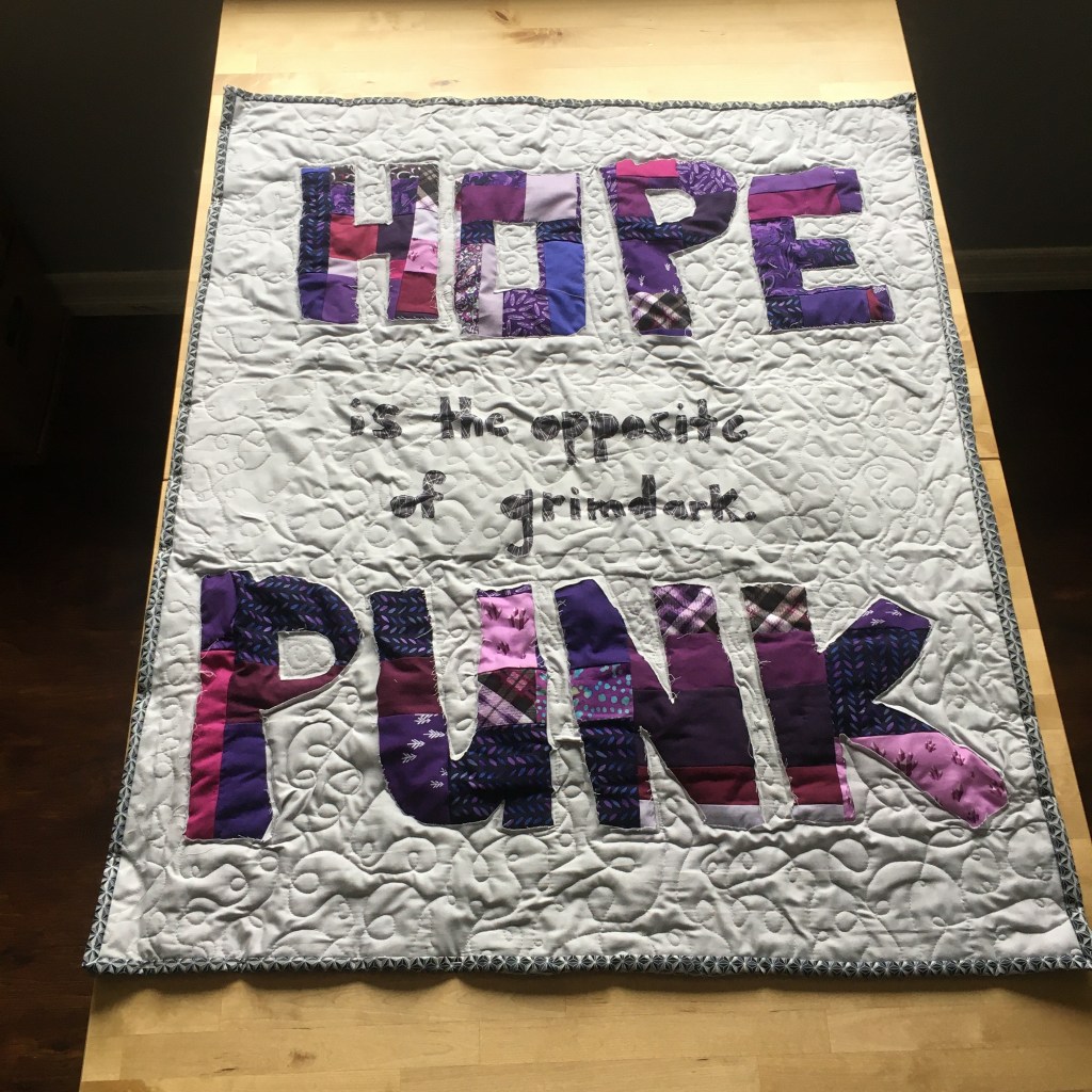 Quilter: Kelly H. Quilt Name: Hopepunk is the opposite of grimdark. Pass it on. Designer: Kelly H. Description: I saw an online post by writer Alexanda Rowland in 2017 that said shortly “The opposite of grimdark is hopepunk. Pass it on.” This short little phrase caught on, was expanded into an essay, and now is a shorthand for a genre of fiction. So I wanted to take the spirit of Hopepunk into quilt form. I improv-ed the letters for Hopepunk in all different shades of purple and did a double-layer of batting beneath it to try for the trapunto effect. I also tried reverse applique for the letters (new technique for me). I did a loopy meander for the quilting and framed it with a dark grey binding. Hopepunk is “It’s about doing the one little thing you can do, even if it’s useless: planting seeds in the midst of the apocalypse, spitting on a wildfire. Hope and strength comes from our bonds with each other, from the actions we take as a community, holding hands in the dark….There are no heroes and no villains. There are just people. That’s hopepunk: Whether the glass is half full or half empty, what matters is that there’s water in that glass. And that’s something worth defending.” Opposites Represented: I wanted to contract the explosive nature of punk with rich bold colors and have the text pop off quilt by adding extra batting and only quilting around the letters. The purple should pop off the dull grey everywhere else on the quilt.