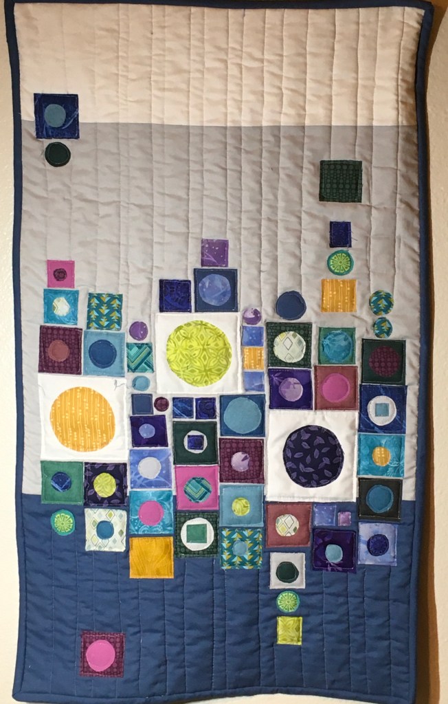 Quilter: Virginia Lucas Quilt Name: Square Pegs, Round Holes Designer: Virginia Lucas Description: Wall Hanging 19” wide x 30” long, raw edge applique Opposites Represented: Shapes, size of shapes, background color