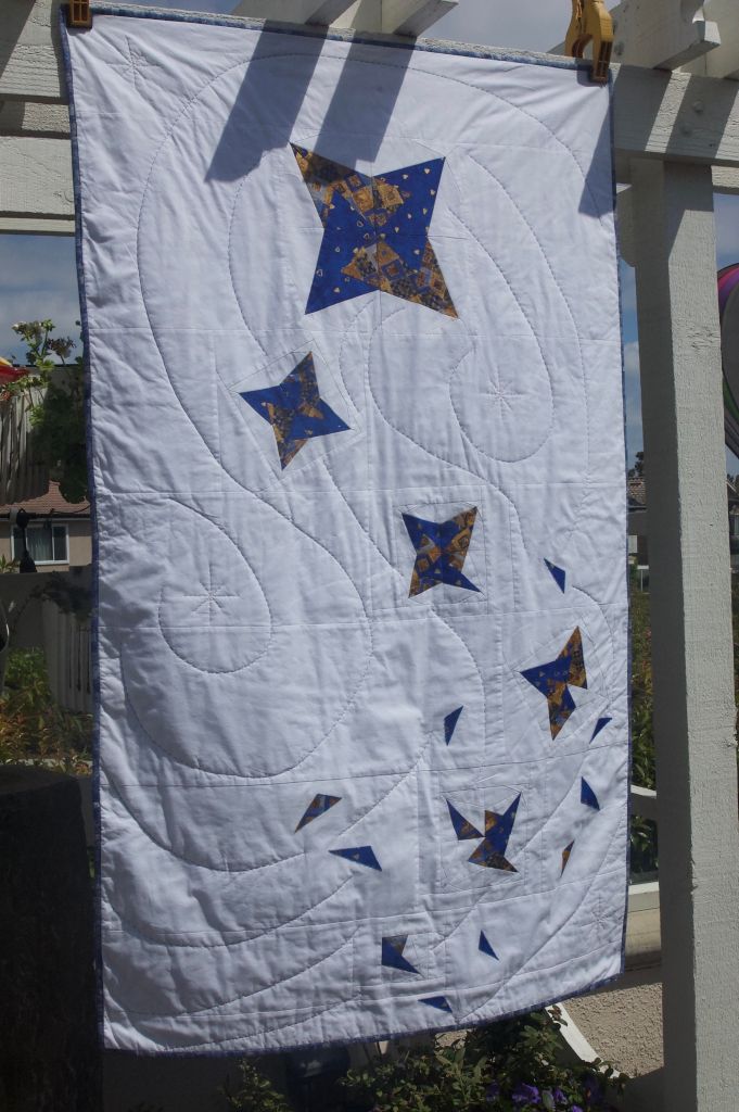 Quilter: Mary O’Bannon Quilt Name: Star Designer: Mary O’Bannon Description: A star falling and disassembling as it falls. I have always wanted to try to figure out a way to make a pattern disassemble. It was a challenge. Opposites Represented: Whole/Part, Large/Small, Up/Down