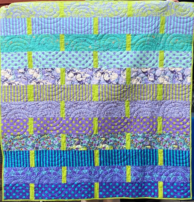 Maker: Betty Alstadt Book: A Book That Takes Its Time About this Quilt: The book and quilt are for an older teenager. The size is 49″ wide by 60″ long. The quilt pattern is based on Tossed Squares by Debra Finan. The fabrics were selected for their cheerfulness and brightness. Fabrics are from Free Spirit Fabrics, including Outlander, Kaffee Fassett, Tula Pink, Riley Blade Glohaven and Moda Zen Chic. The quilting was done by me using a domestic machine.