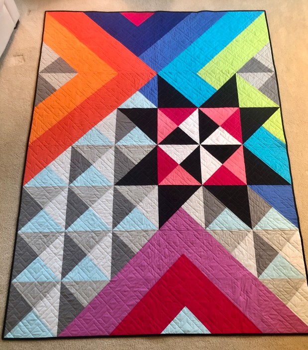For August 2020, the Orange County Modern Quilt Guild challenges its members to create a quilt using one of the five free patterns shown below. These five are among the 84 free patterns that the Modern Quilt Guild has offered to its members. There is a new one offered every month. You will need to log in to the Modern Quilt Guild to view and download the patterns, links provided below.