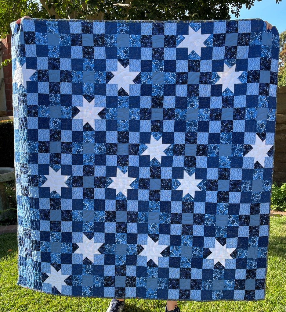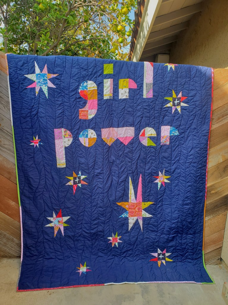 Maker: Gail Sevilla Book:You Will Leave a Trail of Stars by Lisa Congdon Quilt Description:I was inspired by an alphabet I bought from Laura Hartrich, @laurahartrich. I wanted to make something scrappy. Just now, looking at her feed, I guess I was inspired to add stars from a baby quilt she made. Who doesn’t support “Girl Power”? Lisa’s book is full of colorful illustrations and empowering essays. It is actually a coincidence that the colorway turned out to be so close to the cover. I chose the Kona blue “Storm” as it is brighter than navy and would work with all the colors.