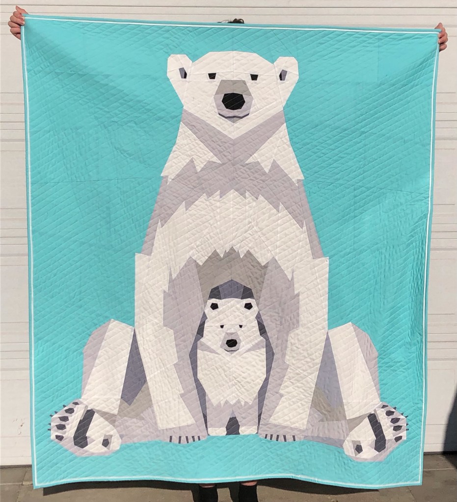 Maker: Barbara Knapp Book: Polar Bears & Bear Came Along Quilt Description: I found this pattern of a momma & baby polar bear and just loved it. The pattern is called Polar Bear Peekaboo and is approximately 55” x 62”. It is the largest foundation paper pieced project I have ever done and really enjoyed doing it. I don’t know how many pieces are in it, but it is a lot. I wanted to keep the quilting simple so I did straight lines at an angle. I also did a double edge binding which gave a little pop of white around the edge.