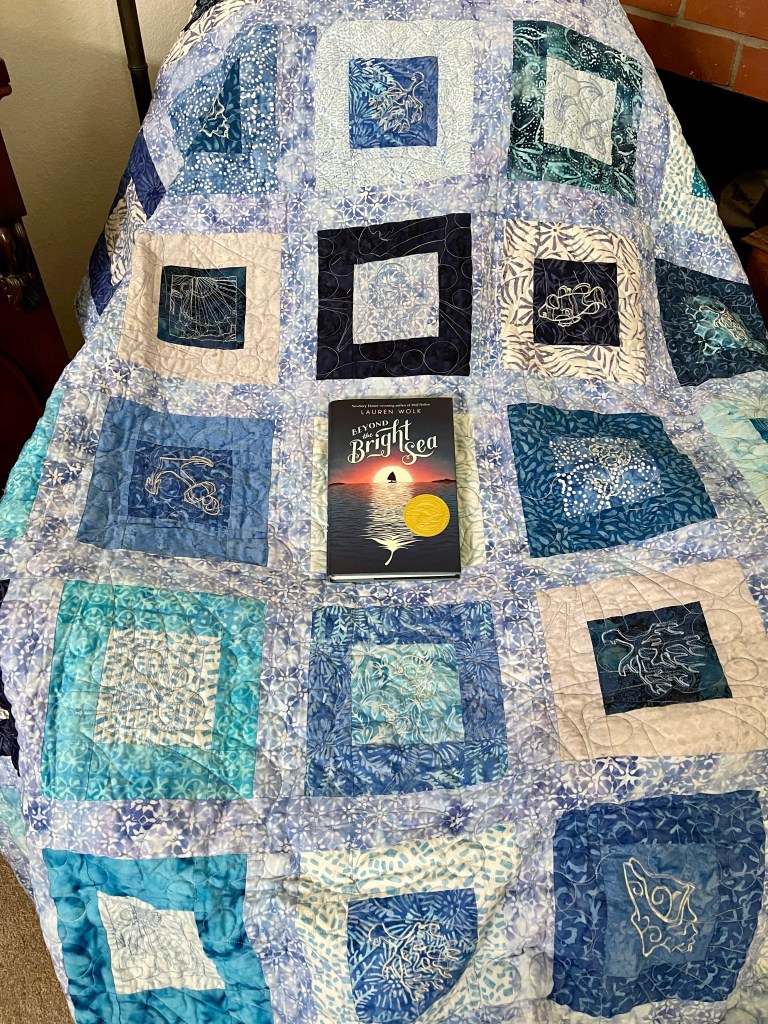 Maker: Sally Sloane Book: Beyond the Bright Sea by Lauren Wolk Quilt Description: This twin size quilt is done from a collection of sea colored batiks with a sea themed embroidery added to the middle of each block.