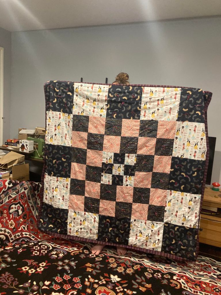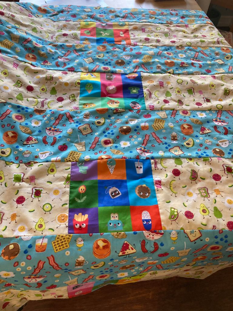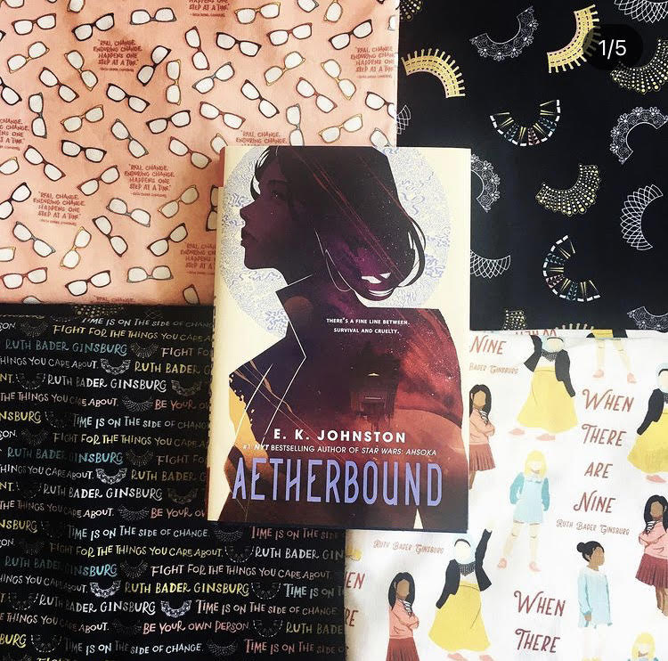 Maker: Kelly Hogan Book: Aetherbound Description: This book was a sci-fi coming of age novel about a young girl breaking free from an abusive home life and starting a new life with friends, food, and kindness. It’s also about autonomy and making choices and how people should be treated. I picked fabrics with happy food for the back. The front has fabrics with empowering messages for girls inspired by RBG.